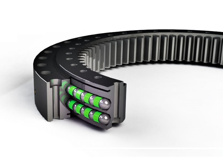 轉盤軸承通常由內圈、外圈、滾動體、隔離塊等四大部件構成。由于核心部件采用回轉支承,因此可以同時承受軸向力、徑向力。 其形式很多,但結構組成基本大同小異。般情況下,轉盤軸承自身均帶有安裝孔、潤滑油和密封裝置,可以滿足各種不同工況條件下工作的各類主機的不同需求;另方面,轉盤軸承本身具有結構緊湊、引導旋轉方便、安裝簡便和維護容易等特點。